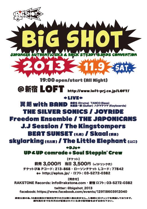 オーセンティック・スカ & ロック・ステディ・バンドにスポットをあてたイヴェントとして1999年にスタートし、今年で14回目となる『BIG SHOT 2013』。記念すべき初回にはDeterminationsも出演したこのイヴェントに、今年は当時のメンバーだった巽朗が BANDを従えて出演することが決定。全国から集結する11組プのオーセンティック・スカ & ロック・ステディ・バンドを一気に見るまたとないチャンス。